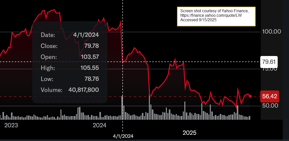 1. Steve Gelsi, Market Watch, “Lamb Weston leads losses among S&P 500 stocks in its largest one-day drop ever on earnings miss” April 4, 2024. URL: https://www.marketwatch.com/story/lamb-westons-stock-drops-sharply-on-earnings-miss-reduced-outlook-on-system-change-4e2ca9ec (Accessed: 9/15/2025)