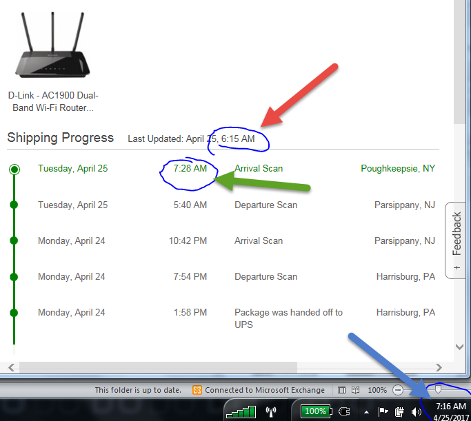 This time we'll look at Validity and how to use it to maintain your credibility with customers. In the first example, provided by one the blog's readers, we see that a new Wi-Fi router was purchased online and the customer is tracking the delivery progress. It shipped from Harrisburg, Philadelphia successfully on April 24th and the expecting customer is checking the status at 7:16AM on April 25th (Blue Arrow: see local PC's date/time in bottom right corner).